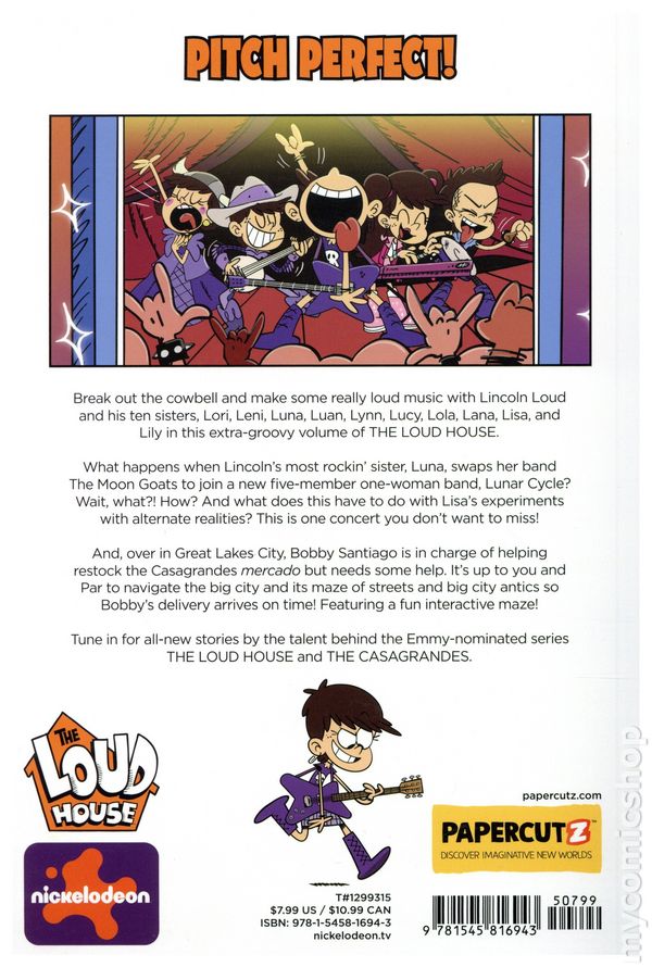 Volume 24 - 1st printing. "Movin' to Music!" Written by Anna Rich, Kiernan Sjursen Lien, Jair Holguin, Amanda Lioi, Mikey Levitt, Kayla Parker, Dan Xmas, and Rebecca E. Banks. Art by Lex Hobson, Amanda Tran, Daniela Rodriguez de la Pena, Olivia Walden, Jose D. Hernandez, Amanda Lioi, Sazo Aguiar, Kelsey Wooley, Erin Hyde, Jennifer Hernandez, RuhisuART, and D. Terrell. Cover by Isaiah Kim. Back Cover by Erin Hyde. Break out the cowbell and make some really loud music with Lincoln Loud and his ten sisters, Lori, Leni, Luna, Luan, Lynn, Lucy, Lola, Lana, Lisa, and Lily in this extra-groovy volume of THE LOUD HOUSE. What happens when Lincolns most rockin sister, Luna, swaps her band The Moon Goats to join a new five-member one-woman band, Lunar Cycle? Wait, what?! How? And what does this have to do with Lisas experiments with alternate realities? This is one concert you dont want to miss! And, over in Great Lakes City, Bobby Santiago is in charge of helping restock the Casagrandes mercado but needs some help. Its up to you and Par to navigate the big city and its maze of streets and big city antics so Bobbys delivery arrives on time! Featuring a fun interactive maze! Tune in for all-new stories by the talent behind the Emmy-nominated series THE LOUD HOUSE and THE CASAGRANDES. Softcover, 6-in.x 9-in., 64 pages, full color. All Ages Cover price $7.99.