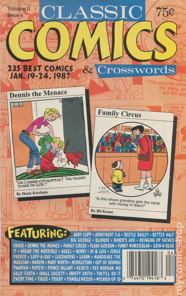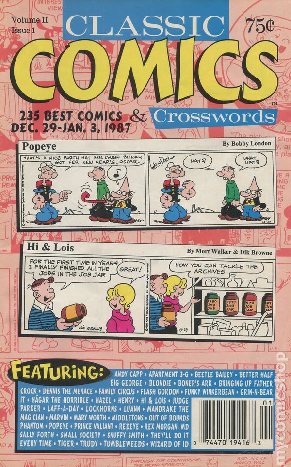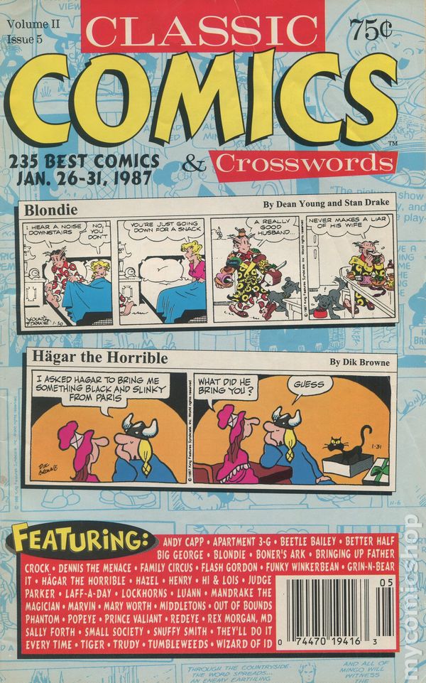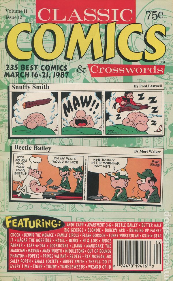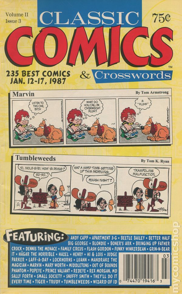 December 29 - January 3, 1987. $0.75 Cover price. This series collects comic strips with crossword puzzles. Featuring many King Feature comic strips including Andy Capp, Apartment 3-G, Beetle Bailey, Better Half, Big George, Blondie, Crock, Dennis the Menace, Family Circus, Flash Gordon, Funky Winterbean, Grin and Bear It, Hägar the Horrible, Hazel, Hi & Lois, Judge Parker, Lockhorns, Luann, Marvin, Mandrake the Magician, Mary Worth, Popeye, Phantom, Prince Valiant (Sunday), Rex Morgan, Sally Forth, Snuffy Smith, They'll Do It Every Time, Tiger, Trudy, Tumbleweeds, and Wizard of Id. 48 pages, B&W. Cover price $0.75.