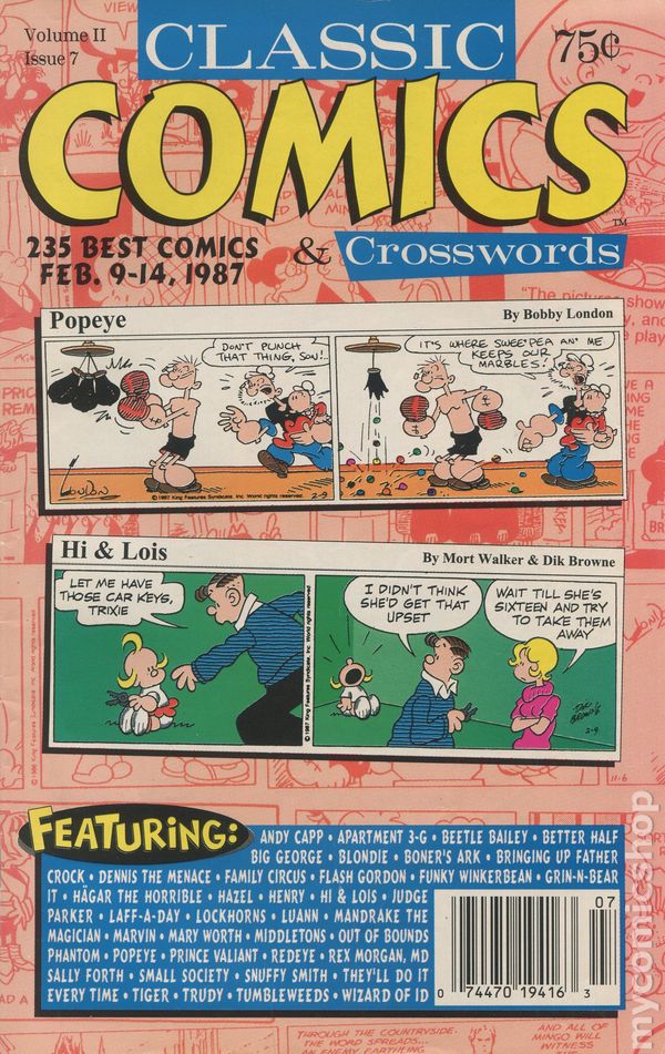 February 9-14, 1987. $0.75 Cover price. This series collects comic strips with crossword puzzles. Featuring many King Feature comic strips including Andy Capp, Apartment 3-G, Beetle Bailey, Better Half, Big George, Blondie, Crock, Dennis the Menace, Family Circus, Flash Gordon, Funky Winterbean, Grin and Bear It, Hägar the Horrible, Hazel, Hi & Lois, Judge Parker, Lockhorns, Luann, Marvin, Mandrake the Magician, Mary Worth, Popeye, Phantom, Prince Valiant (Sunday), Rex Morgan, Sally Forth, Snuffy Smith, They'll Do It Every Time, Tiger, Trudy, Tumbleweeds, and Wizard of Id. 48 pages, B&W. Cover price $0.75.