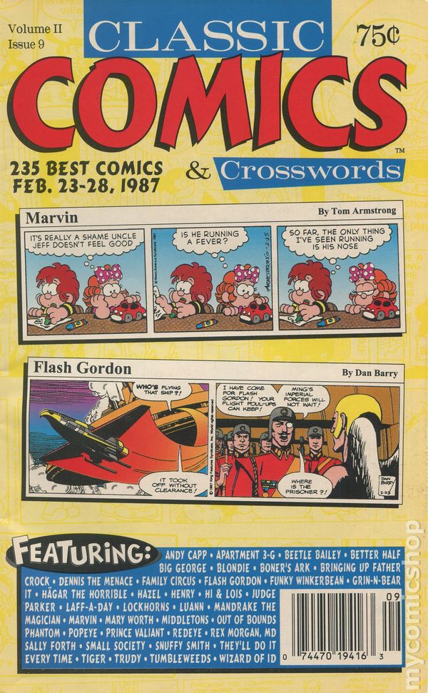 February 16-21, 1987. $0.75 Cover price. This series collects comic strips with crossword puzzles. Featuring many King Feature comic strips including Andy Capp, Apartment 3-G, Beetle Bailey, Better Half, Big George, Blondie, Crock, Dennis the Menace, Family Circus, Flash Gordon, Funky Winterbean, Grin and Bear It, Hägar the Horrible, Hazel, Hi & Lois, Judge Parker, Lockhorns, Luann, Marvin, Mandrake the Magician, Mary Worth, Popeye, Phantom, Prince Valiant (Sunday), Rex Morgan, Sally Forth, Snuffy Smith, They'll Do It Every Time, Tiger, Trudy, Tumbleweeds, and Wizard of Id. 48 pages, B&W. Cover price $0.75.