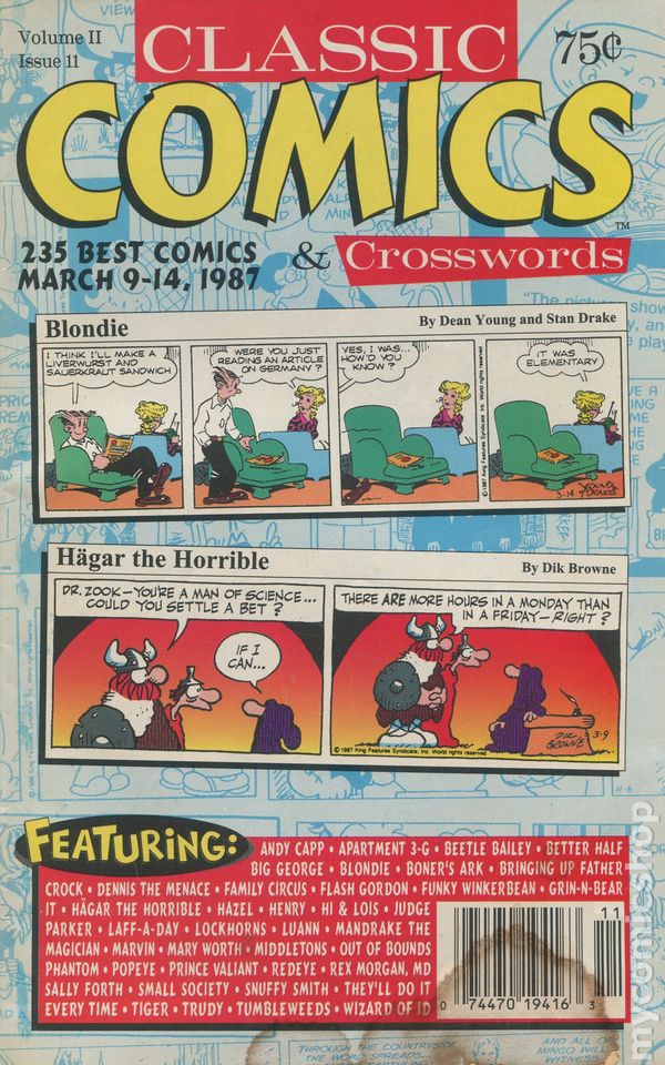 March 2-7, 1987. $0.75 Cover price. This series collects comic strips with crossword puzzles. Featuring many King Feature comic strips including Andy Capp, Apartment 3-G, Beetle Bailey, Better Half, Big George, Blondie, Crock, Dennis the Menace, Family Circus, Flash Gordon, Funky Winterbean, Grin and Bear It, Hägar the Horrible, Hazel, Hi & Lois, Judge Parker, Lockhorns, Luann, Marvin, Mandrake the Magician, Mary Worth, Popeye, Phantom, Prince Valiant (Sunday), Rex Morgan, Sally Forth, Snuffy Smith, They'll Do It Every Time, Tiger, Trudy, Tumbleweeds, and Wizard of Id. 48 pages, B&W. Cover price $0.75.