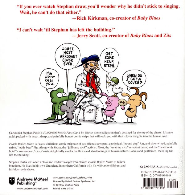 Pearls Before Swine is Pastis's hilarious comic strip tale of two friends: arrogant, egotistical, "hound dog" Rat, and slow-witted, painfully naive, "teddy bear" Pig. Along with Zebra, the "jailhouse rock" activist; Goat, the "treat me nice" reluctant brain; and the "heartbreak hotel" carnivorous Crocs, Pearls delightfully mocks the flaws and shortcomings of human nature. Ladies and gentlemen, the King has left the building.