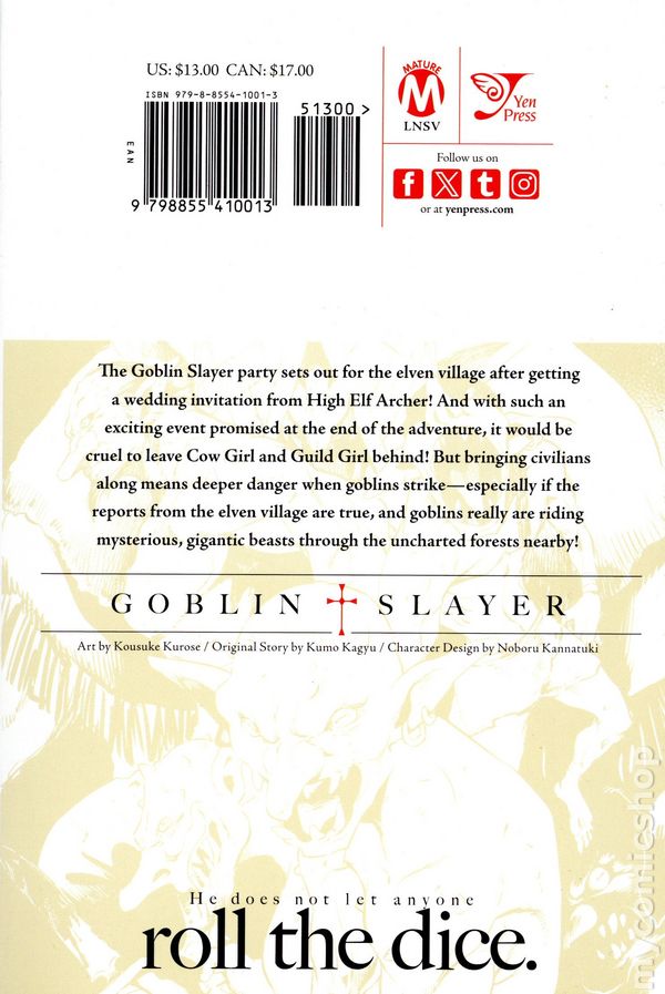Volume 15 - 1st printing. Written by Kumo Kagyu. Art and cover by Kousuke Kurose. Character Design Noboru Kannatuki. Translated by Kevin Steinbach. The Goblin Slayer party sets out for the elven village after getting a wedding invitation from High Elf Archer! And with such an exciting event promised at the end of the adventure, it would be cruel to leave Cow Girl and Guild Girl behind! But bringing civilians along means deeper danger when goblins strike—especially if the reports from the elven village are true, and goblins really are riding mysterious, gigantic beasts through the uncharted forests nearby! Softcover, 5-in. x 7-in., 182 pages, B&W. Mature Readers Cover price $13.00.