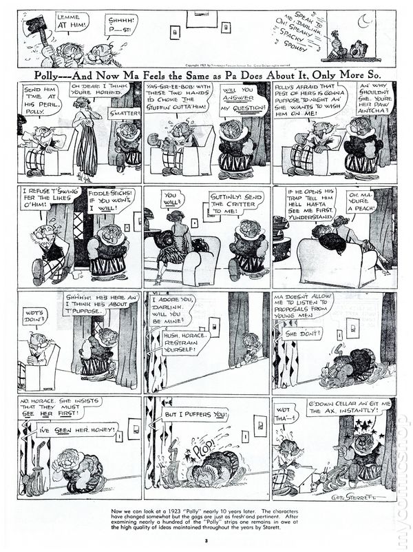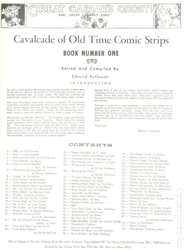 Cavalcade of Old Time Comic Strips, Vol. 1 (1967) reprints samples from a variety of comic strips that were popular in the 1920's and 1930's, published by Tower Press, Inc. of Lynn, Mass. Strips include Polly, Felix the Cat, Happy Hooligan, Bringing Up Father, Thimble Theatre, Gasoline Alley, Tim Tyler's Luck, Barney Google, Katzenjammer Kids, Flash Gordon (Alex Raymond), Blondie, Krazy Kat, Joe Palooka, and may others. Edited and compiled by Edward Kutlowski. 11-in. x 14-3/4-in., 76 pages (counting covers), black and white, cardstock cover with white paper interior (but mediocre reproduction quality). No cover price.