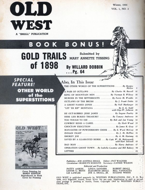 Stories of the western frontier. Short story "Gunplay!" by William B. Secret. "Reporting a Gold Rush", "Letter Rip!". 8 1/4-in. x 11-in., 96 pages, B&W with illustrations and photos. Cover price $0.50.