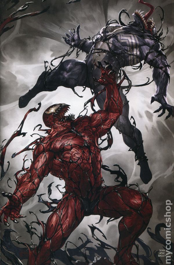 Comic Mint exclusive variant cover by Mike Mayhew. Written by Donny Cates. Art by Danilo Beyruth. Join DONNY CATES as he continues to snake his tendrils through the VENOM mythos - this time visiting the sickening sociopath called CARNAGE! A cruel cannibal obsessed with death and murder, few mourned Cletus Kasady after he seemingly died in VENOMIZED. But now a cult devoted to the madman has gathered, hoping to resurrect their fallen idol and return his madness to the Marvel Universe... 36 pages, full color. Rated T+