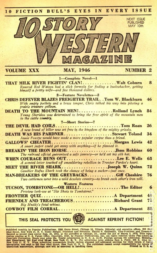 Volume 27, Issue 4 - July, 1945. Complete novel: "The Breaking of Law-Dog Tate" by William Heuman - Town Marshal Tate's steel nerve was cracking, just when a gigantic swindle was about to be pulled in Sage City. Two feature novelettes: "King of Jackass Hill" by Frank Bonham - Footloose Andy Farrell tried settling down...to find that he was in love with a gold-hearted beauty, and mixed up in a crooked winning deal; "Rock Mountain Dies Tonight!" by Branch Carter - Belligerent young Johnny introduced himself to Crossville by beating up its lawman and rawhiding its cattle baron. Seven short stories: "Juan Poker - Registrar of Death" by Tom W. Blackburn - Poker was a witness to his own doom; "Hero-Maker of Two Creeks" by Gunnison Steele - A hero to his friends, Conly lived in stark fear; "Shave an' a Killin' - Two Bits!" by Giff Cheshire - A barber and a barfly bucked a pair of gun aces; "Roundup for the Pinto Button" by Barry Gardner - Pinto figured he had the answer to a crooked horse-stealing charge; "Phantom Horses" by Paul Craig - Brit cracked his whip over six spectral horses; "Hang a Polecat High!" by Philip Ketchum - Maybe Tull should have raked up the guts to fight; "Ghost Village" by Joseph W. Quinn - The amazing story of how gold changed the destiny of a nation. And Western features: "Satan and Son" - a preview look-see at Walt Coburn's "Here's Blood in Your Eye!"; "Cowboy Film Corral" - Behind the scenes with the Western stars. 7-in. x 10-in., 98 pages, B&W. Cover price $0.15.