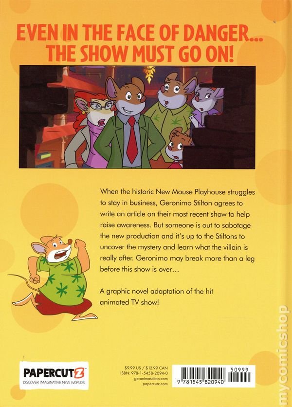 Volume 20 - 1st printing. "Starring Geronimo!" Written by Geronimo Stilton (and Davide Costa). Art and cover by Alessandro Muscillo. When the New Mouse Playhouse struggles to keep afloat, Geronimo agrees to write an article on their most recent show. But strange events that occur in the vicinity of the theater threaten the production. Sally Ratmousen is after a secret room in the New Mouse Playhouse and will use every dirty trick in the book to have it close down to grant them free access, even sabotage the next production. However, the Stiltons are on the case and may get in on the secret to help save the day. Hardcover, 7-in. x 9-in., 64 pages, full color. Cover price $9.99.