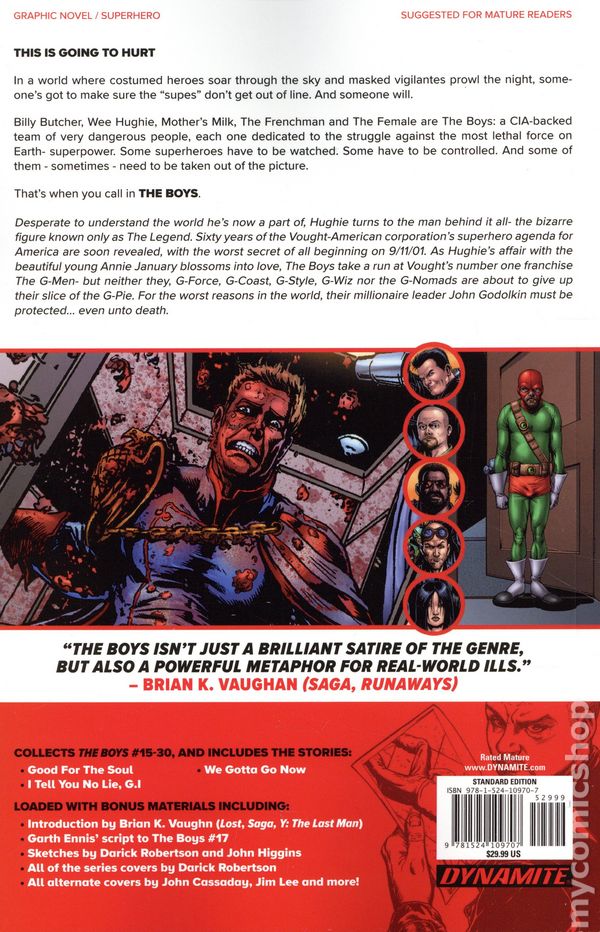 Loaded with bonus materials including: Introduction by Brian K. Vaughan; Garth Ennis' script to Boys (2006-2012) #17; sketches by Darick Robertson and John Higgins; all of the series covers by Darick Robertson; and all alternate covers by John Cassaday, Jim Lee and more.