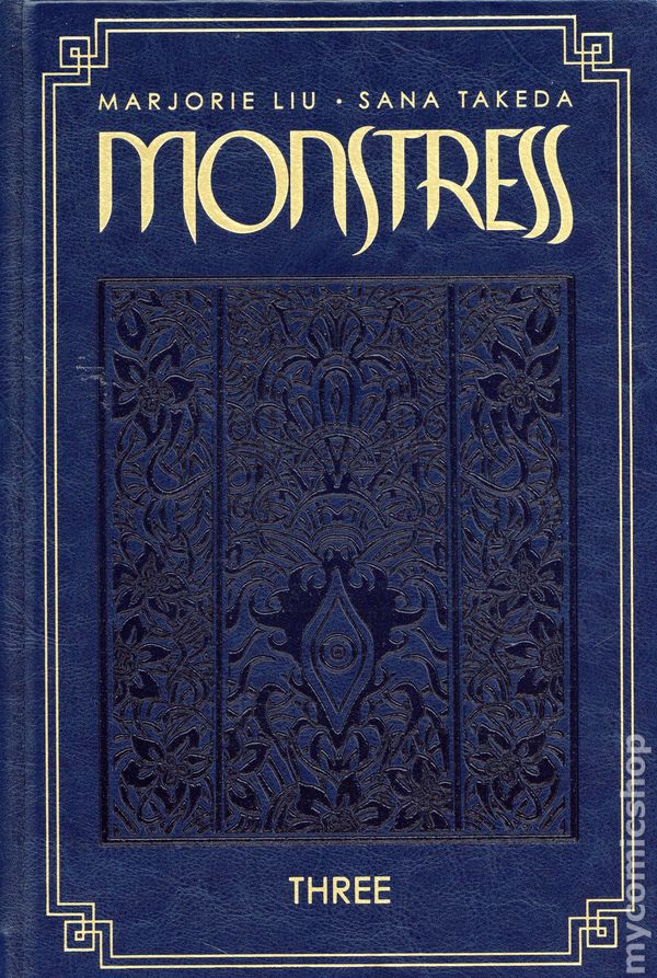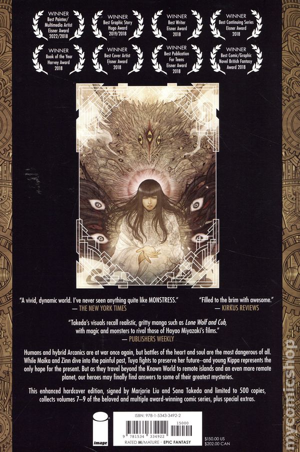 Volume 3 - 1st printing. Collects Monstress (2015 Image) #36-54. Written by Marjorie M. Liu. Art and cover by Sana Takeda. Creator/writer MARJORIE LIU and creator/artist SANA TAKEDA present a deluxe, oversized hardcover edition of their beloved breakout comic in MONSTRESS BOOK THREE. Humans and hybrid Arcanics are at war once again, but battles of the heart and soul are the most dangerous of all. Caught in the calculating grip of the Dusk Court, Maika and Zinn uncover painful secrets of the past while Tuya fights to preserve her future—and young Kippa represents the only hope for the present. MONSTRESS, BOOK THREE takes readers beyond the Known World to remote islands and an even more remote planet as our heroes finally find answers to some of their greatest mysteries. Collecting volumes 7-9 (issues #36-54) of the Eisner, Hugo, Harvey & British Fantasy Award-winning series by MARJORIE LIU and SANA TAKEDA, this deluxe, oversized hardcover brimming with more than 500 pages of art deco beauty and steampunk horror will make an elegant addition to any fan's shelf. Hardcover, 528 pages, full color. Mature Readers Cover price $49.99.