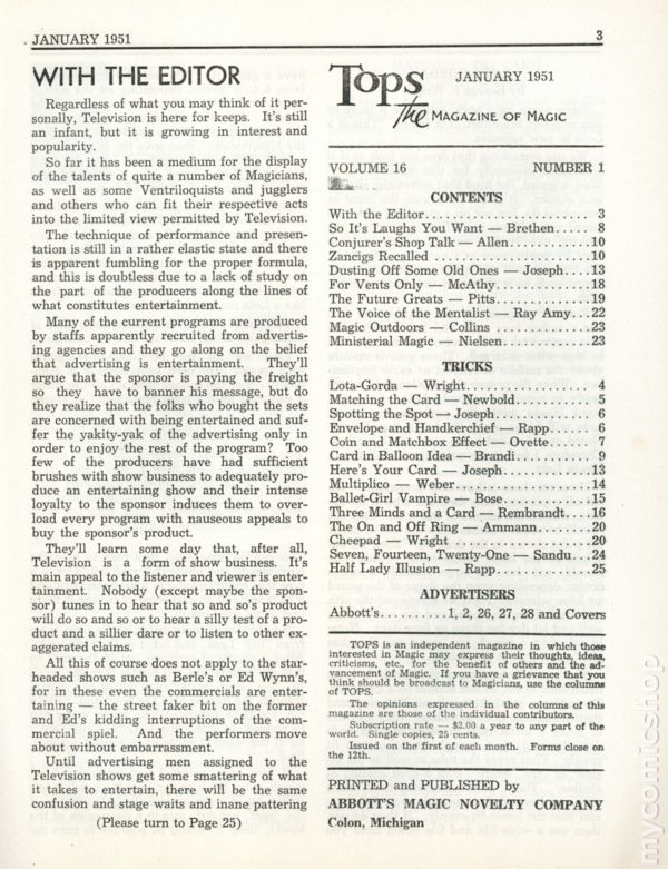 Tops (1936-1957 Abbott Magic & Novelty Co.) Vol. 16 #1Published 1951 (est.) by Abbott Magic & Novelty Co..