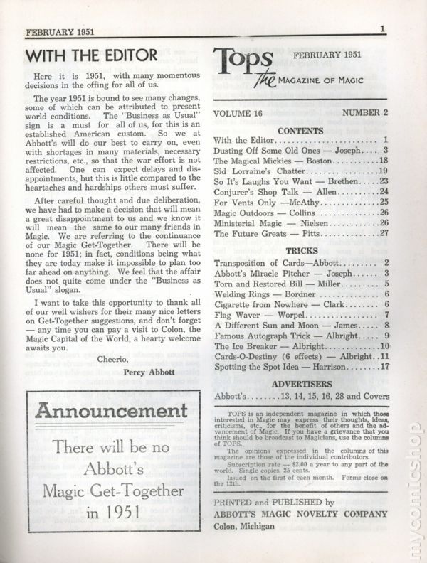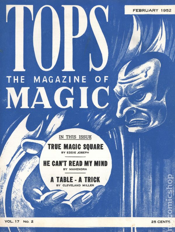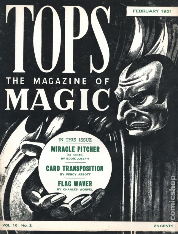 Tops was a Magic Periodical first published in January 1936 by the Abbott Magic & Novelty Company for magic enthusiasts. 8.5" x 11", 32 pages, B&W. Cover price $0.25.