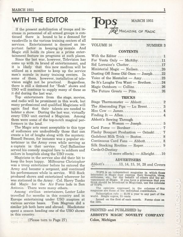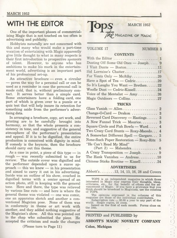 Tops (1936-1957 Abbott Magic & Novelty Co.) Vol. 15 #3Published Mar 1950 by Abbott Magic & Novelty Co..
