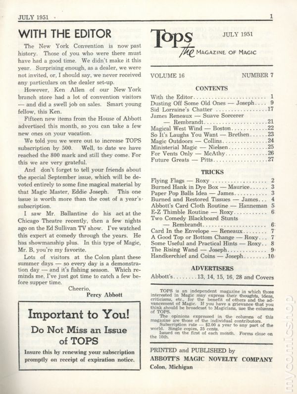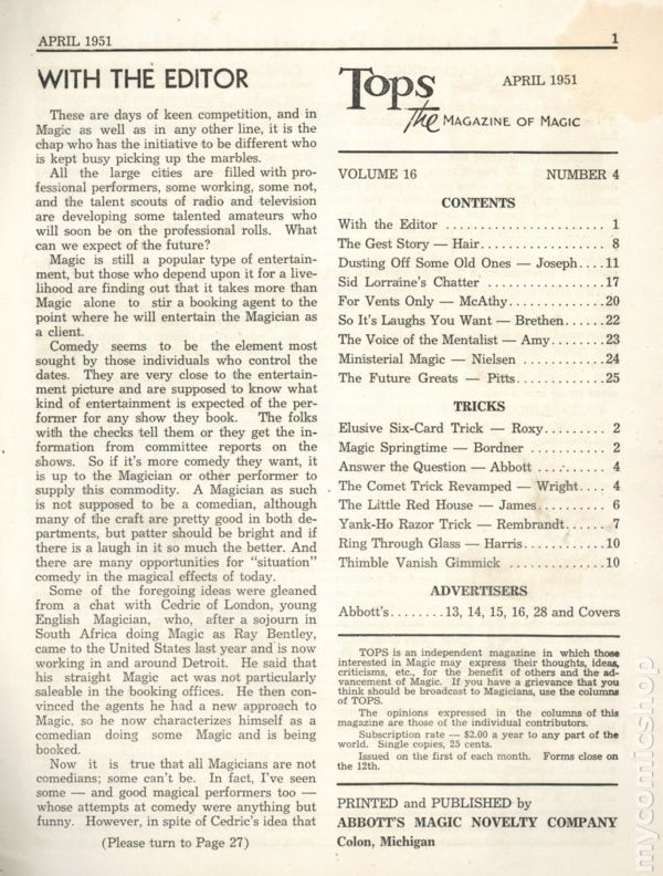 Tops (1936-1957 Abbott Magic & Novelty Co.) Vol. 16 #7Published 1951 (est.) by Abbott Magic & Novelty Co..