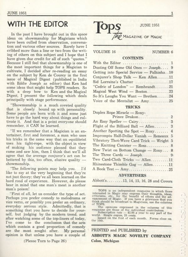Tops (1936-1957 Abbott Magic & Novelty Co.) Vol. 16 #6Published 1951 (est.) by Abbott Magic & Novelty Co..