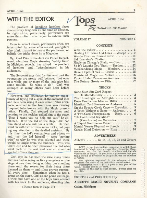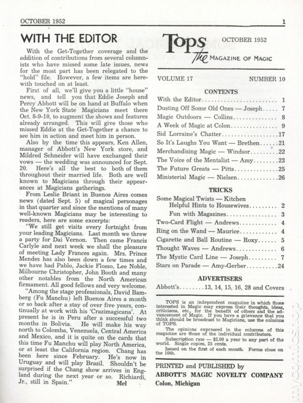 Tops (1936-1957 Abbott Magic & Novelty Co.) Vol. 17 #1Published 1952 (est.) by Abbott Magic & Novelty Co..