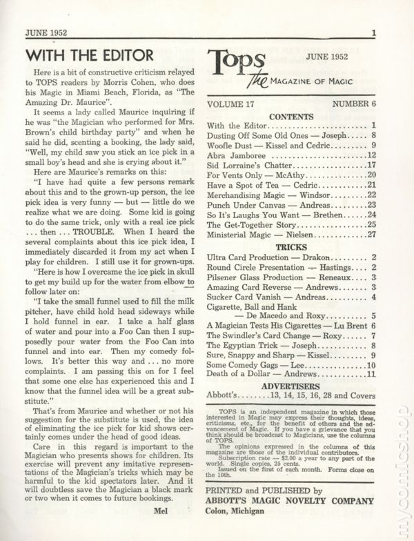 Tops (1936-1957 Abbott Magic & Novelty Co.) Vol. 17 #6Published 1952 (est.) by Abbott Magic & Novelty Co..