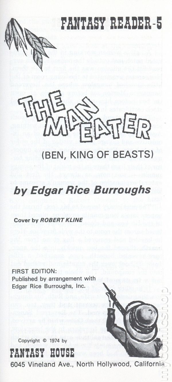 The Man Eater by Edgar Rice Burroughs. Cover by Robert Kline. Originally published in 1915, this novel should be placed between Tarzan of the Apes and The Beasts of Tarzan. Although not a Tarzan novel, the primary lion character bears a striking resemblance to Tarzan's golden lion and the locations are the same. 4-in x 8.25-in, 100 Pages, Text Only. Cover price $1.00.