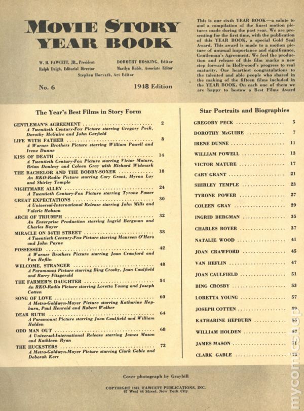 Issue 6 - 1948. The year's best films in story form. Illustrated with stills from the movies. "Kiss of Death", "Miracle of 34th Street", "Possessed" and 13 more. Short biographies on Gregory Peck, Joan Crawford, Bing Crosby, James Mason, Clark Gable, Ingrid Bergman, Cary Grant and many more. 8.5-in. x 11.25-in., 96 pages, B&W. Cover price $0.25.