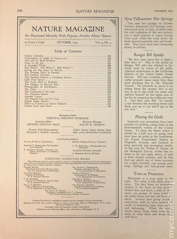 View scansVolume 4, Issue 4 - October, 1924. Magazine published by The American Nature Association to stimulate public interest in every phase of nature and the out-doors, and is devoted to the practical conservation of the great national resources of America. Softcover, 8" x 11.5", 68 pages, B&W. Cover price $0.25.