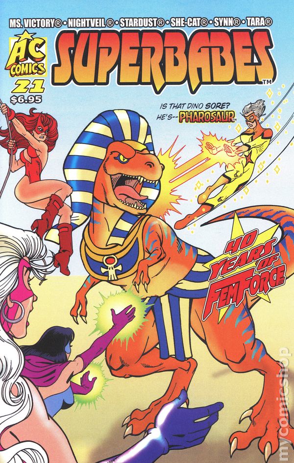 Written by Mark & Stephanie Heike. Art by Mark & Stephanie Heike, Will Broadbent and Bobby Ragland. Cover by Mark & Stephanie Heike Have history, biology and archeology gotten it wrong? That question haunts The FEMFIRCE when they encounter the most awesome menace of the 21st century- PHAROASAUR!! What can his mysterious and enigmatic appearance portend for Ms. VICTORY, NIGHTVEIL, SHE-CAT, SYNN, TARA and STARDUST? Great GOOD GIRL art in FULL COLOR!! Cover price $6.95.