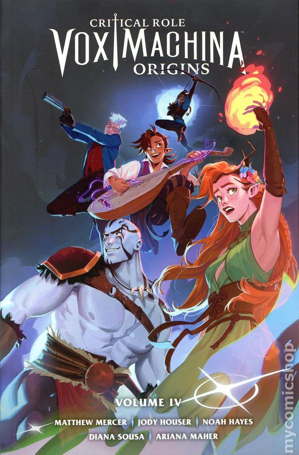 Volume 4 - 1st printing. Collects Critical Role: Vox Machina - Origins IV (2024 Dark Horse) #1-6. Written by Jody Houser. Art by Noah Hayes. Cover by Alisvart. After the disappearance of Sir Fince, Vox Machina is tasked with investigating his whereabouts. After some poking and prodding, the team is led to a mysterious basement where dark forces loom. Meanwhile, Vax and Pike face off against a vicious chimera which puts both of their fighting skills to the test, and the rest of the crew navigate an underground cavern in hopes of reuniting with the two. It'll take the help of an unexpected ally to guide the members of Vox Machina to their next objective-the Clasp's headquarters. Softcover, 152 pages, full color. Cover price $19.99.
