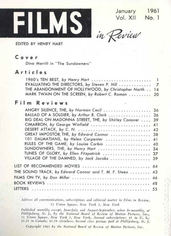 View scans\Film in Review is a publication of the National Board of Review of Motion Pictures, Inc, an independent, non-profit organization of public citizens founded in 1909 to represent the interests of the motion picture public. This National Board further assists the development of the motion picture as a source of entertainment, as education, and as art, by providing media for the expression of the public's opinion about films and their cultural and social effects. Plus movie reviews and letters. 5 1/2-in. x 7 1/2-in., 63 pages, B&W. Cover price $0.75.