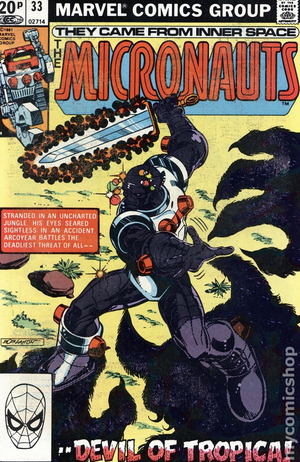 UK edition. Identical to US edition, but has 20p cover price. Cover art by Pat Broderick. "Snowblind," script by Bill Mantlo, pencils by Pat Broderick, inks by Danny Bulanadi; The Micronauts are off to find the second key to restore the Enigma Force and divert the disaster that looms over the Microverse; They travel to the snow covered zone of Subzero; The Prince of Subzero, Prince Peacock is hunting the Snowbear, not any snowbear but the one that carries the symbol on its chest of the second key; The legend has it, that the slaying of the snowbear will save the kingdom, but the slayer will lose the thing which they hold most dear. "Wonders of Nature" Hostess Fruit Pies ad featuring the Fantastic Four. 36 pgs., full color.