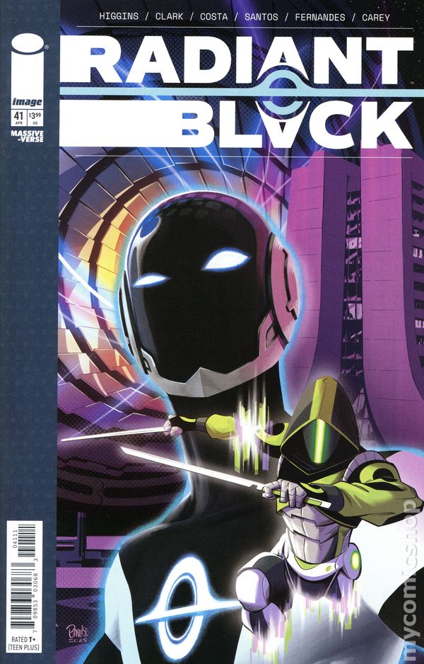 Written by Kyle Higgins, Joe Clark. Art by Marcello Costa, Eduardo Ferigato. Cover by Eduardo Ferigato, Marcello Costa. A bold new era of Radiant Black continues! As Marshall struggles to balance being Radiant Black and having a personal life, a new threat rises from the wreckage of the Catalyst War! And if that wasn't bad enough...is something even more sinister lurking in the shadows? 28 pages, full color. Rated T+ Cover price $3.99.