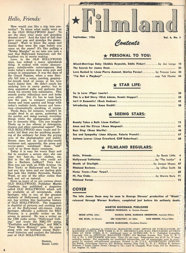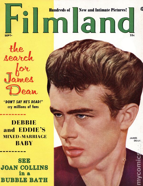 James Dean photo cover. Film fan magazine with a focus on the celebrity lives of the golden-age of cinema. 8.5" x 11", 76 pages, B&W. Cover price $0.25.