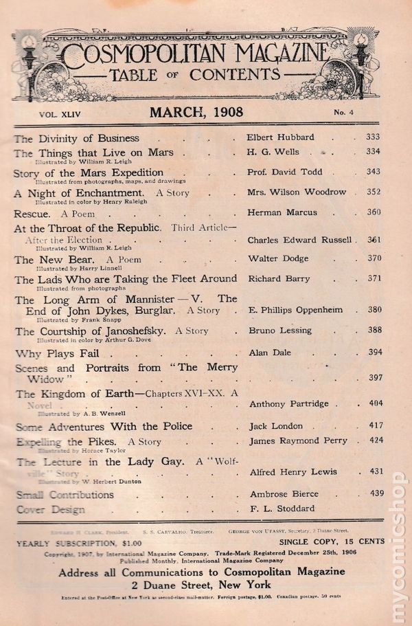 Cosmopolitan is a long-running fashion and entertainment magazine focused on women. Cover by Frederick Lincoln Stoddard. This issue includes: First publication of an essay by H. G. Wells, "The Things that Live on Mars", with four full-page illustrations by William Robinson Leigh, about the habitability and possibility of life on Mars, ideas that Wells had previously explored a decade earlier in his science fiction novel "The War of the Worlds". Also, "Story of the Mars Expedition", an essay by American astronomer David Peck Todd describing the 1907 Lowell expedition to Chile, an attempt to capture images of the purported Martian canals; and "Small Contributions" a regular column to the magazine by Ambrose Bierce. 7" x 10", 130 pages, B&W. Cover price $0.15.