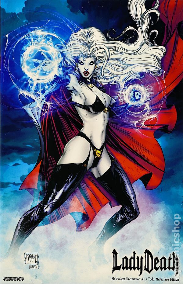 Todd McFarlane Edition Variant Cover by Todd McFarlane and Andy Arias - limited to 4000 copies. Written by Brian Pulido, Mike MacLean. Art by Diego Bernard. Lady Death has always been the BAD GIRL. But once upon a time, she was absolutely EVIL. Obsessed with annihilation, the diva of death sought to snuff out the entire human race and turn the earth into an endless graveyard. Thankfully, Lady Death changed her wicked ways to become a champion of the downtrodden and a scourge of demon-kind throughout Hell. For generations, the evil seething within the witch's soul lied dormant....forgotten...until now! Something has awakened-a sinister passion that leads Lady Death to the darkest corners of the globe. Leaving piles of bloody bodies in her wake, she seeks a mysterious power never before seen by mankind. But for what nefarious purpose? Featuring the key first appearance of the newest Coffinverse characters: Devilock, Demon hunter Muuaji and the hoodoo princess Madam Midnight. Also guest starring La Muerta! 32 pages, full color.