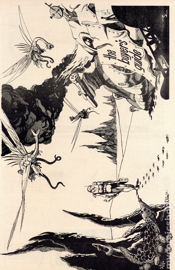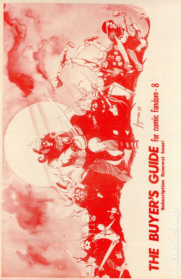 View scansThe Buyer's Guide for Comic Fandom #5 (August, 1971) is an early-era comics ad zine featuring comic for sale lists and ads for the many fan publication of the period. This issue features a snazzy Bob Kline sci-fi cover. Also features a cool Berni Wrightson drawing in an ad for Metro-Con '71. Page 3 features a half-page ad from Buddy Saunders, who several years later would open the first Lone Star Comics store in Arlington, Texas. 12 pages, black and white on newsprint, tabloid 11.5-in. x 17.5-in. NOTE: Early issues were mailed free to interested comic collectors; back issues could be ordered at 25c ea. Later the publication moved to paid subscriptions. Cover price $2.00.
