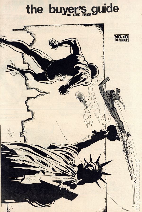The Buyer's Guide for Comic Fandom #10 (Dec, 1971) is an early-era comics ad zine featuring comic for sale lists and ads for the many fan publication of the period. This issue features a Donald Newton cover featuring the Sub-Mariner and Human Torch in battle over the Statue of Liberty. Page 10 features a half-page ad from Buddy Saunders who, years later, would open the first Lone Star Comics store in Arlington, Texas. 24 pages, black and white on newsprint, tabloid 11.5-in. x 17.5-in. NOTE: Early issues were mailed free to interested comic collectors; back issues could be ordered at 25c ea. Later the publication moved to paid subscriptions. Cover price $2.00.