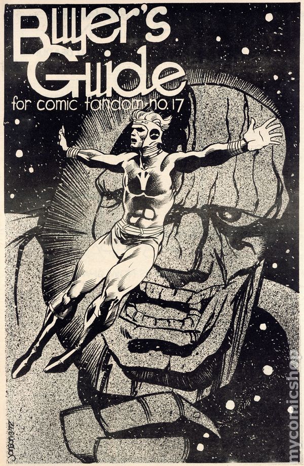 The Buyer's Guide for Comic Fandom #17 (July, 1972) is an early-era comics ad zine featuring comic for sale lists and ads for the many fan publication of the period. This issue features a Klaus Janson cover portraying Kirby's Lightray and Darkseid. Features an editorial by Alan Light, and a half-page ad from Buddy Saunders who, years later, would open the first Lone Star Comics store in Arlington, Texas. 44 pages, black and white on newsprint, tabloid 11.5-in. x 17.5-in. NOTE: Early issues were mailed free to interested comic collectors; back issues could be ordered at 25c ea. Later the publication moved to paid subscriptions.