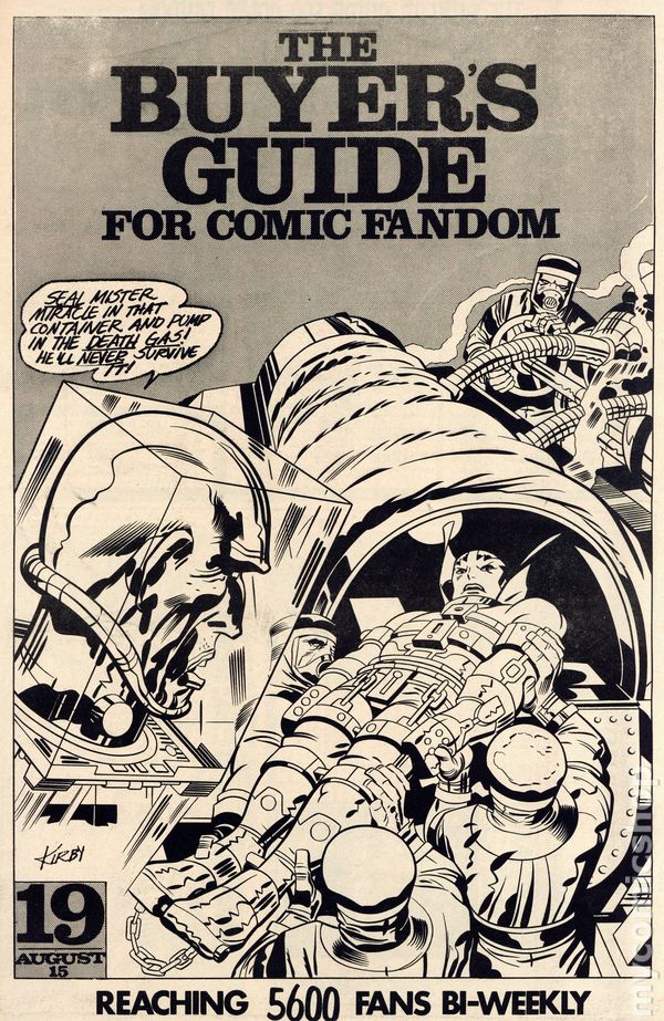 The Buyers Guide for Comic Fandom #19 - August 15, 1972. Cover artist Jack Kirby. Don and Maggie Thompson's column, Beautiful Balloons, begins in this issue. Page 26 features a half-page ad from Buddy Saunders who, years later, would open the first Lone Star Comics store in Arlington, Texas. 44 pages in two sections, B&W on newsprint.