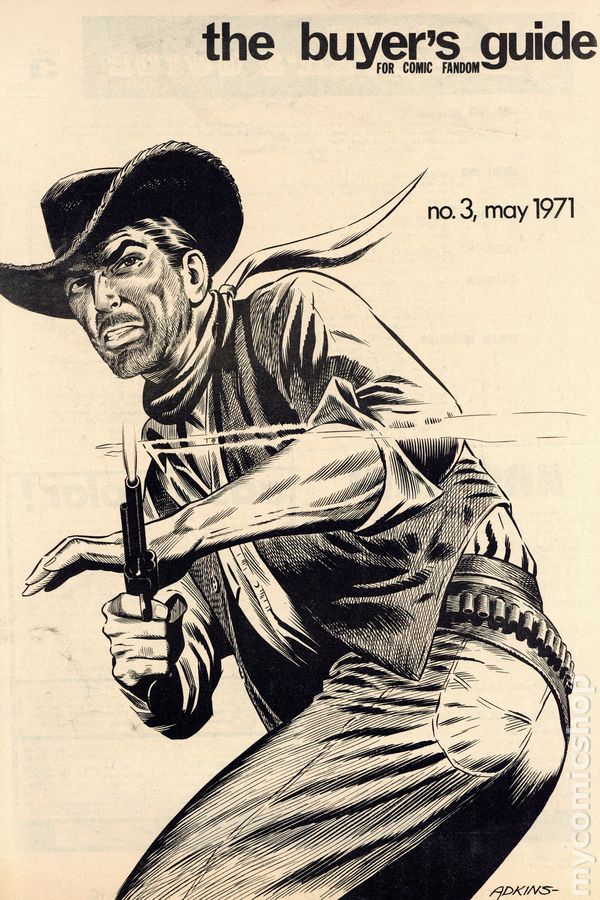 View scansThe Buyer's Guide for Comic Fandom #3 (May, 1971) is an early-era comics ad zine featuring comic for sale lists and ads for the many fan publications of the period. Cover by Dan Adkins. Includes a 1/2 page ad from Buddy Saunders, owner of Lone Star Comics and mycomicshop.com. 12 pages, black and white on newsprint, tabloid 11.5-in. x 17.5-in. NOTE: Early issues were mailed free to interested comic collectors; back issues could be ordered at 25c ea. Later the publication moved to paid subscriptions. Cover price $2.00.