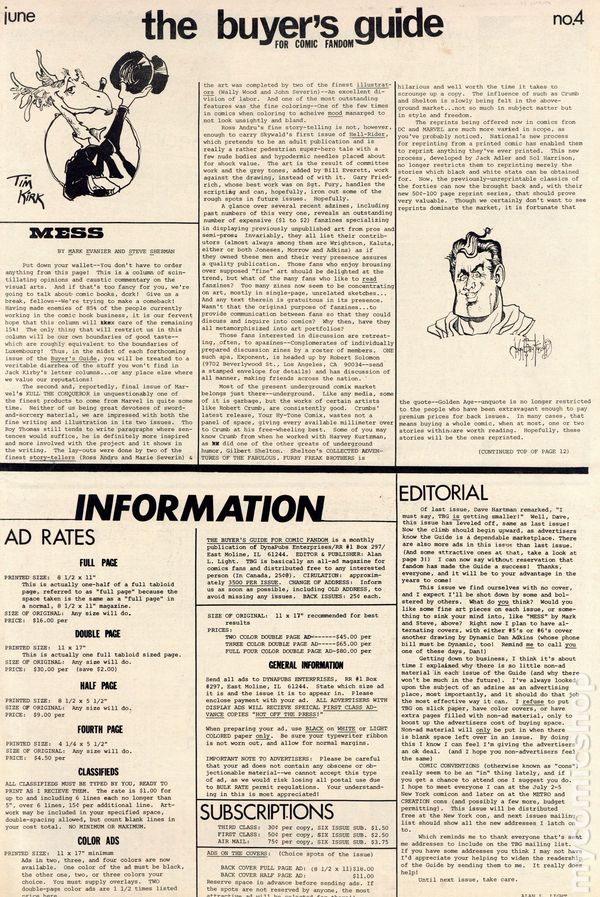 Column by Mark Evanier and Steve Sherman (MESS). Tim Kirk illustration. Neal Pozner fanzine ad. Full page ads were just $16.00 and you could have ordered an Avengers #1 in VG to NM condition (that's how much looser grading was back then!) for just $5.00. Who was the seller? None other than Buddy Saunders, the owner of Lone Star Comics and Mycomicshop.com. We've been in the comic books business a VERY long time, almost as long as we've been collecting comics! 16 pages, black and white on newsprint, tabloid 11.5-in. x 17.5-in. Cover price $2.00.