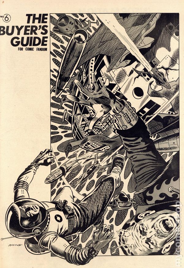 The Buyer's Guide for Comic Fandom #6 (August, 1971), and early era comics ad zine featuring comic for sale lists and ads for the many fan publication of the period. This issue features a Dan Adkins science fiction cover. Page four features a half-page ad from Buddy Saunders who six years later would open the first Lone Star Comics store in Arlington, Texas. Buddy also appears in the letters section along with Jan Strnad (Dalgoda creator). 16 pages, black and white on newsprint, tabloid 11.5-in. x 17.5-in. NOTE: Early issues were mailed free to interested comic collectors; back issues could be ordered at 25c ea. Later the publication moved to paid subscriptions. Cover price $2.00.