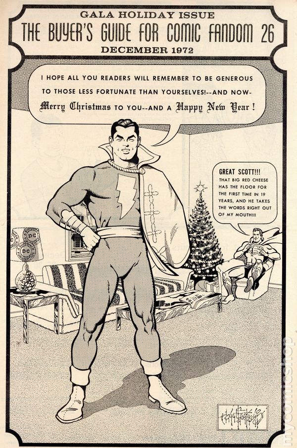 The Buyer's Guide for Comic Fandom # (September 15, 1972) is an early-era comics ad zine featuring comic for sale lists and ads for the many fan publication of the period. This issue features a Jim Hanley cover featuring the Captain Marvel Family. Features an announcement that Don and Maggie Thompson had a baby (Stephen), and an obit for Max Fleischer. Also features a full page ad for George McGovern for president, and a buyer seeking Incredible Hulk #1 for $10. Page 38 features a half-page ad from Buddy Saunders who, years later, would open the first Lone Star Comics store in Arlington, Texas. 40 pages, black and white on newsprint, tabloid 11.5-in. x 17.5-in. NOTE: Early issues were mailed free to interested comic collectors; back issues could be ordered at 25c ea. Later the publication moved to paid subscriptions.