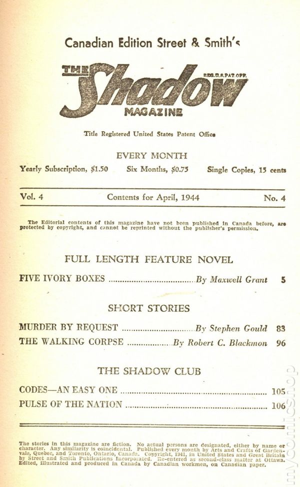 Canadian Edition. March, 1944. Full Length Feature Novel: "The Devil's Feud" by Maxwell Grant. Short Story: "Murder Patrol" by Norman A. Daniels. 116 pages, Text Only with chapter illustrations, 7" x 9.5". Cover price $0.15.