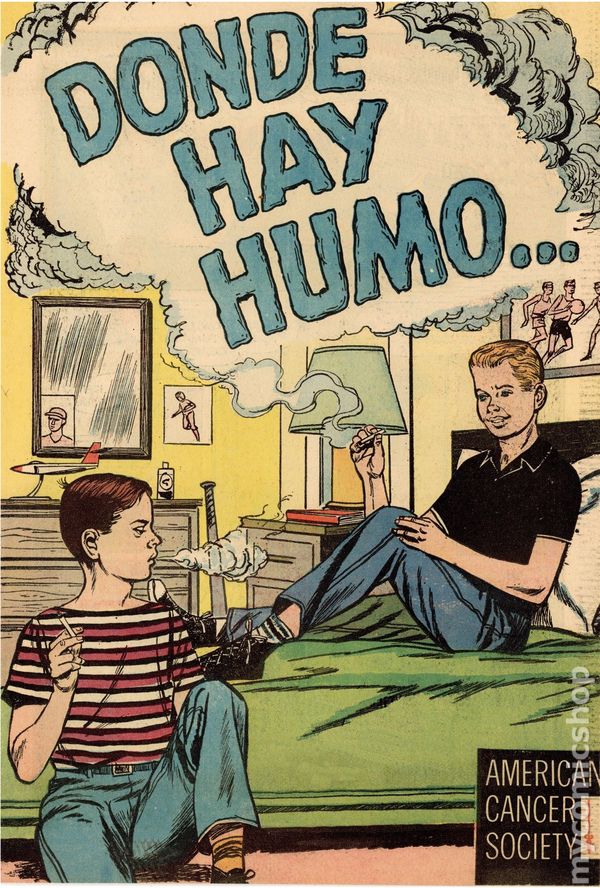 Spanish Edition: Where There's Smoke... (1965) is an informational comic distributed by the American Cancer Society. A typical American family learns why smoking is bad for anyone, regradless of their age. The back cover features illustrations of Bobby Richardson (NY Yankees), Bill Russell, Bob Mathias, Murray Rose, and Bart Starr (Green Bay Packers) proclaiming they are smoke-free. 16 pages, full color, 6.75-in. x 10-in., all newsprint, no cover price.