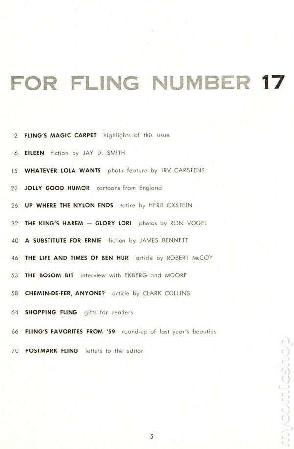 Men's interest magazine with pictorials, fiction, articles and jokes. 8 1/4-in. x 11-in., 72 pages, B&W and color. NOTE: First full sized issue titled as Fling, with numering continued from Fling Festival. Cover price $0.75.