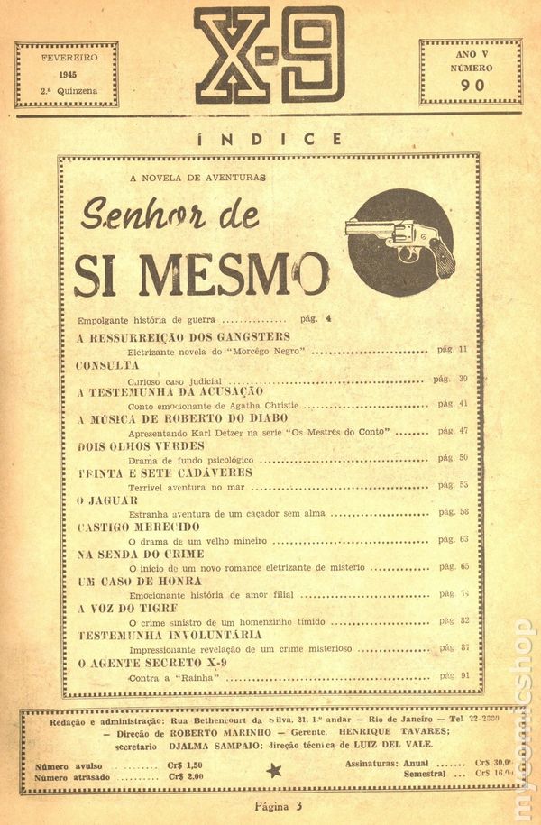 Brazilian series. Fevereiro, 1945. Ano V, Numero 90. Pulp featuring Agent X-9. 90 pages, B&W, 7.25" x 10", Portuguese language.