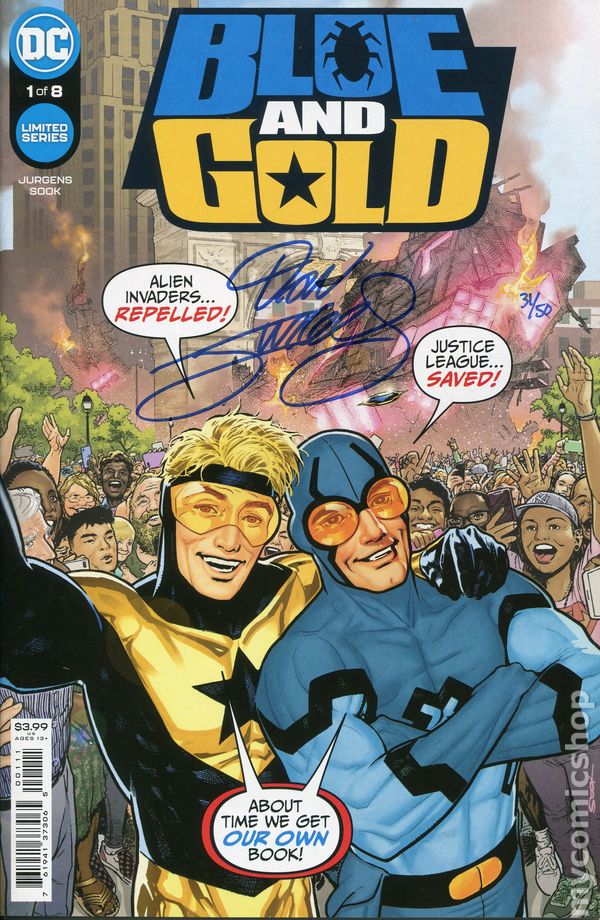 Dynamic Forces Signed Edition. Signed and numbered by Dan Jurgens - limited to 50 copies. Includes Certificate of Authenticity from Dynamic Forces. Written by Dan Jurgens. Art and Cover by Ryan Sook. Desperate to regain the spotlight, Booster Gold looks to attract the publics (and Justice Leagues) attention the same way any washed-up, second-rate hero would—social media. The not-so-tech-savvy hero from the 25th century enlists the help of his best friend, Blue Beetle, who possesses both the money and the brains to help his old pal navigate the scary world of internet influencers. Watch out, evildoers, our heroes are live and online! Dont miss Dan Jurgenss triumphant return to Booster Gold with the help of all-star artist Ryan Sook (Legion of Super-Heroes), telling a tale filled with heart and maybe even redemption for DCs two favorite underdogs! 32 pages, full color. Rated T+ Cover price $3.99.
