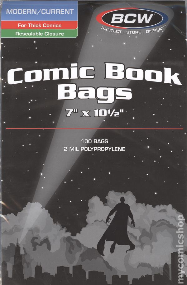 100 Current Size Thick Resealable BCW bags. 2-mil material. Protects all comics up to 7" x 10-1/2". Features a 2" Resealable Flap Closure for extra protection.