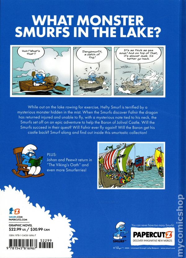 Volume 12 - 1st printing. "Smurfs and the Dragon of the Lake!" Written by Peyo and Alain Jost. Art by Peyo, Jeroen De Coninck, Miguel Diaz. Cover by Peyo. In this smurftastic volume, the Smurfs meet the dragon, Fafnir, and attempt to rescue the Baron of Jolival Castle. Will our smurfy blue friends save the day? Smurf on to find out! Also: Over 40 short comic strips with hilarious smurfy gags featuring all you favorite Smurfs! Plus: The Smurf creator Peyos comedy/adventure series, Johan and Peewit: The Vikings' Oath!, featuring the young squire and the mischievous court jester, that helped launch the Smurfs to stardom. Hardcover, 6-in. x 9-in., 160 pages, full color. All Ages Cover price $22.99.