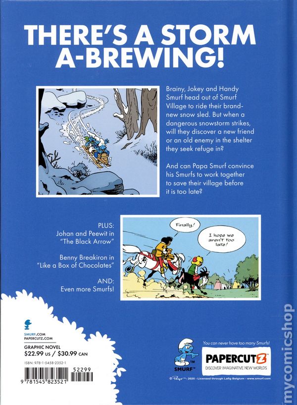 Volume 15 - 1st printing. "The Smurfs and the White Storms and Other Stories!" Written by Peyo, Thierry Culliford, Alain Jost, and Pascal Garray. Art by Peyo, Alan Maury, and Pascal Garray. Cover by Peyo. There's a storm a-brewing Brainy, Jokey and Handy Smurf head out of Smurf Village to ride their brand-new snow sled. But when a dangerous snowstorm strikes , will they discover a new friend or an old enemy in the shelter they seek refuge in? And can Papa Smurf convince his Smurfs to work together to save their village before it is too late? Plus - Johan and Peewit The Black Arrow Benny Breakiron Like a Box of Chocolates And more Smurfs! Hardcover, 6-in. x 9-in., 160 pages, full color. All Ages Cover price $22.99.