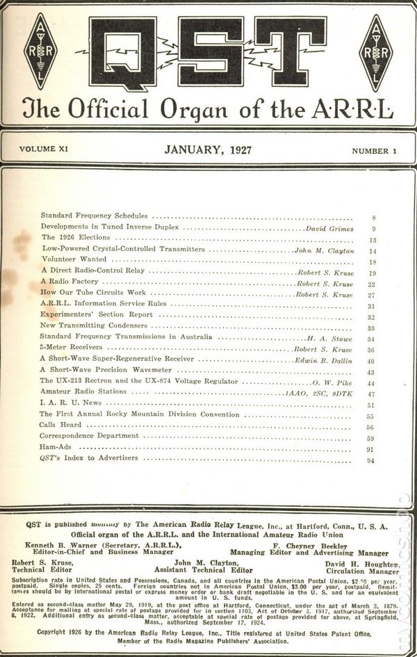 January 1927. A magazine for the amateur wireless operators. 6.5" x 9.5", 100 pages, B&W. Cover price $0.25.