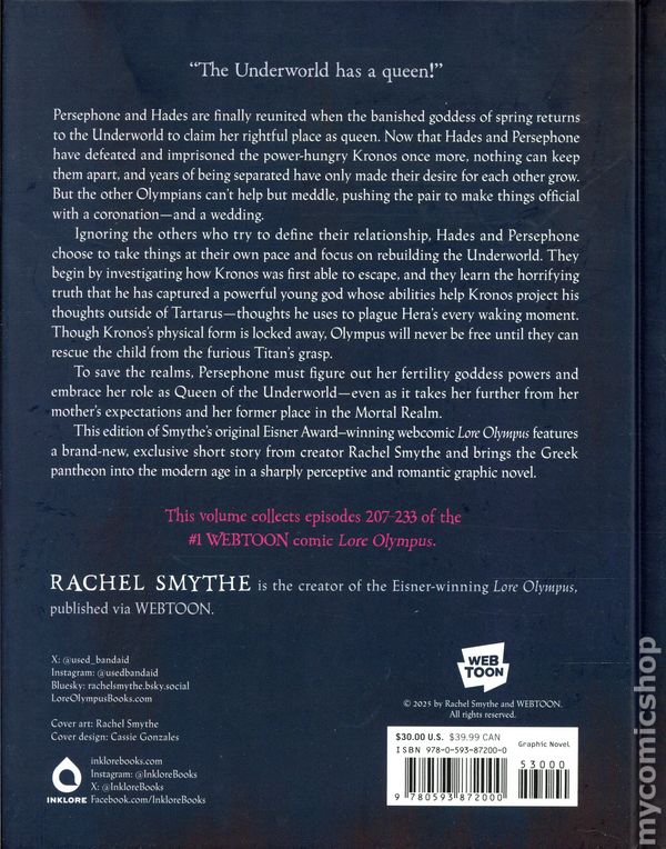 Volume 5 - 1st printing. Written by Rachel Smythe. Art and cover by Rachel Smythe and Edwin Vazquez. Translated by Anastasia. Scandalous gossip, wild parties, and forbidden love-the Greek tale of Hades and Persephone gets a romantic modern update in the gorgeously illustrated, Eisner Award-winning Lore Olympus, including behind-the-scenes content!An ingenious take on the Greek Pantheon, Lore Olympus is a modern update on the story of Hades and Persephone. Follow the propulsive love story of two Greek gods, told with lavish artwork and contemporary sensibilities. This full-color edition of Smythe's original Eisner Award-winning webcomic Lore Olympus features exclusive behind-the-scenes content and brings Greek mythology into the modern age in a sharply perceptive and romantic graphic novel. This volume collects episodes 103-126 of the #1 WEBTOON comic Lore Olympus. Hardcover, 416 pages, full color. Cover price $27.99.